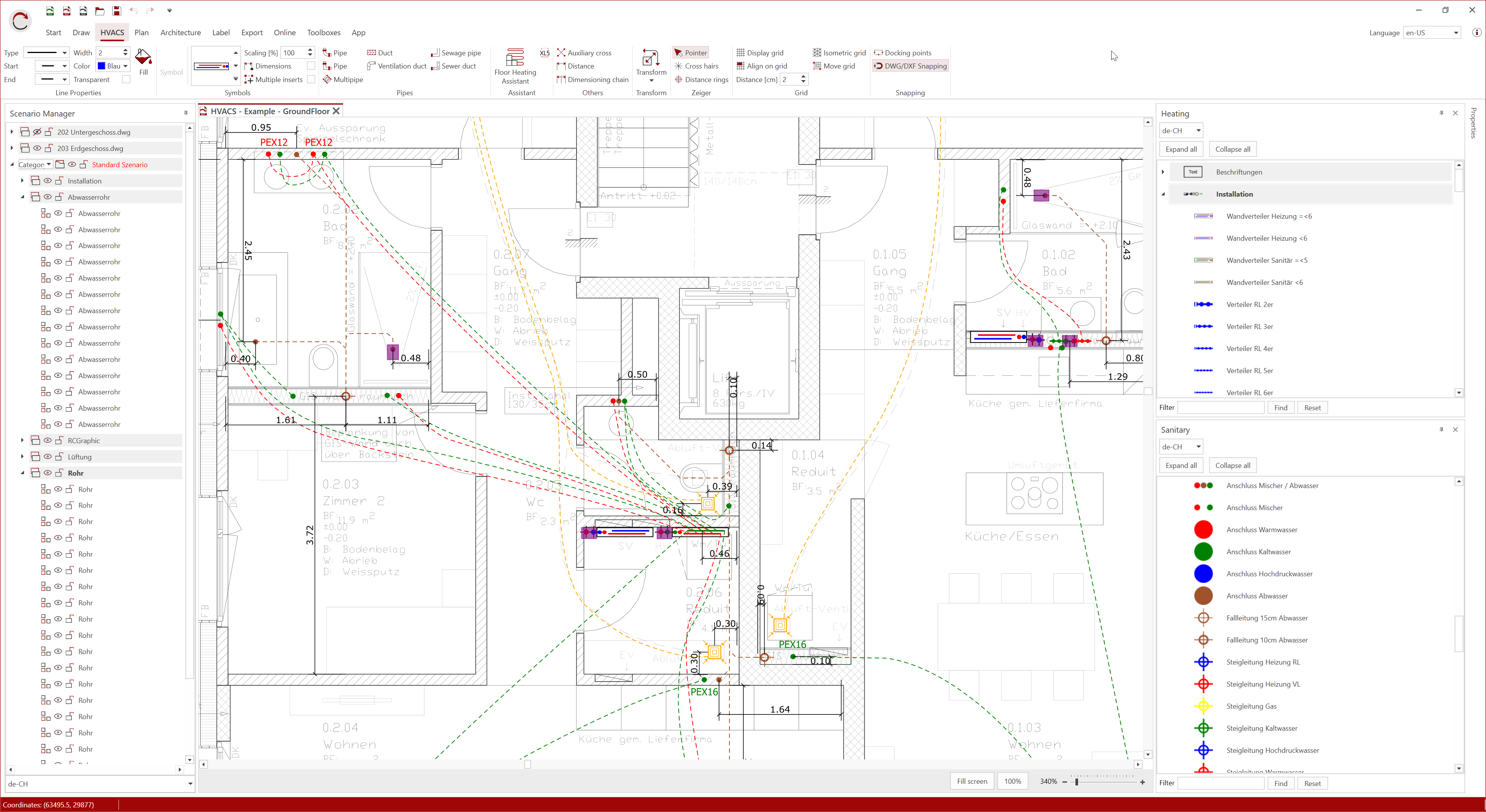 With RED CAD Plumbing/Heating, you can plan your projects efficiently and conveniently in 2D. The software offers a wide selection of industry-specific symbols and allows you to easily import individual manufacturer symbols in DWG format. Thanks to automatic piping dimensioning, professional layer control and intuitive architectural functions, CAD planning is significantly simplified and reduced to the essentials.