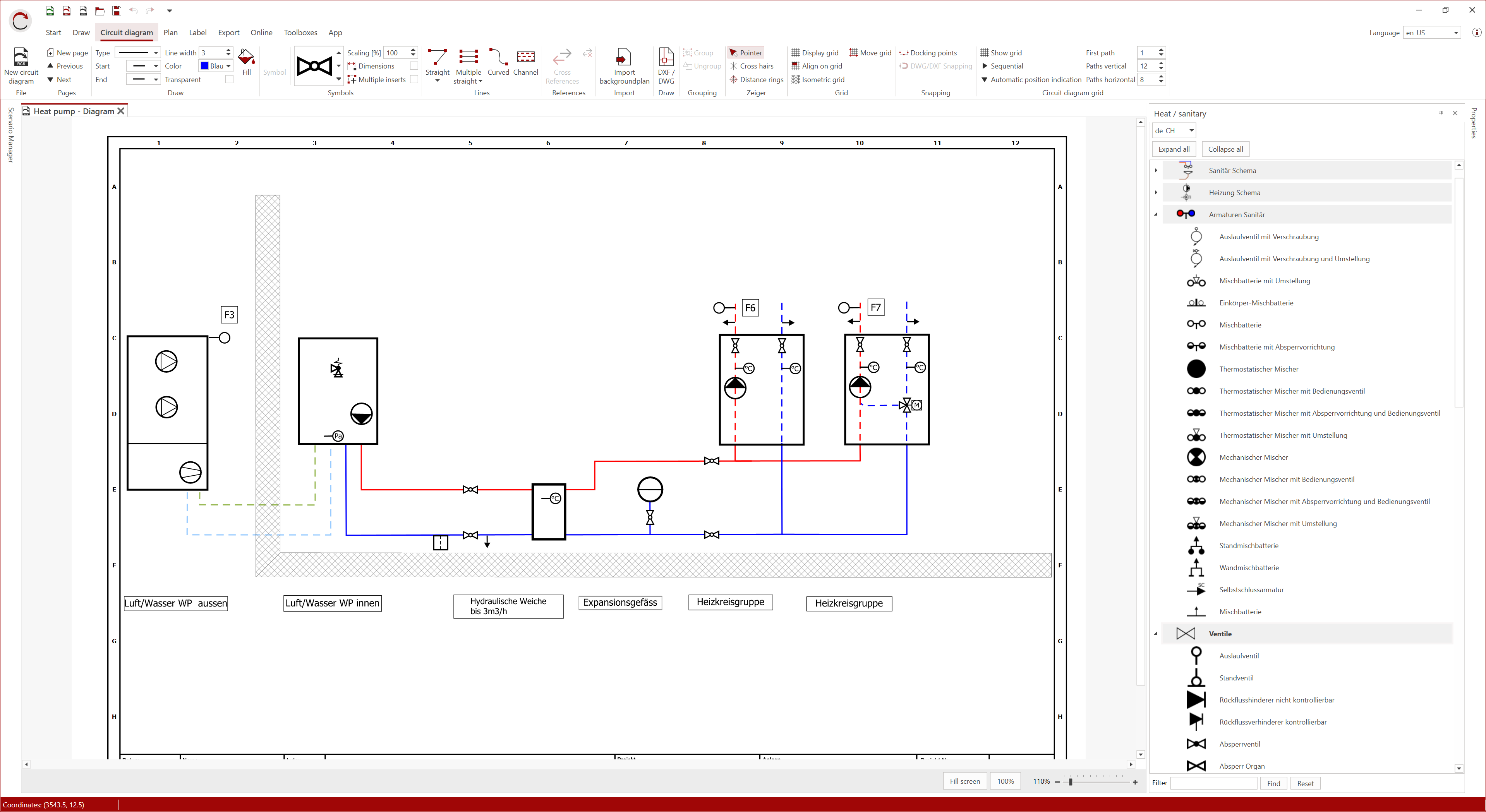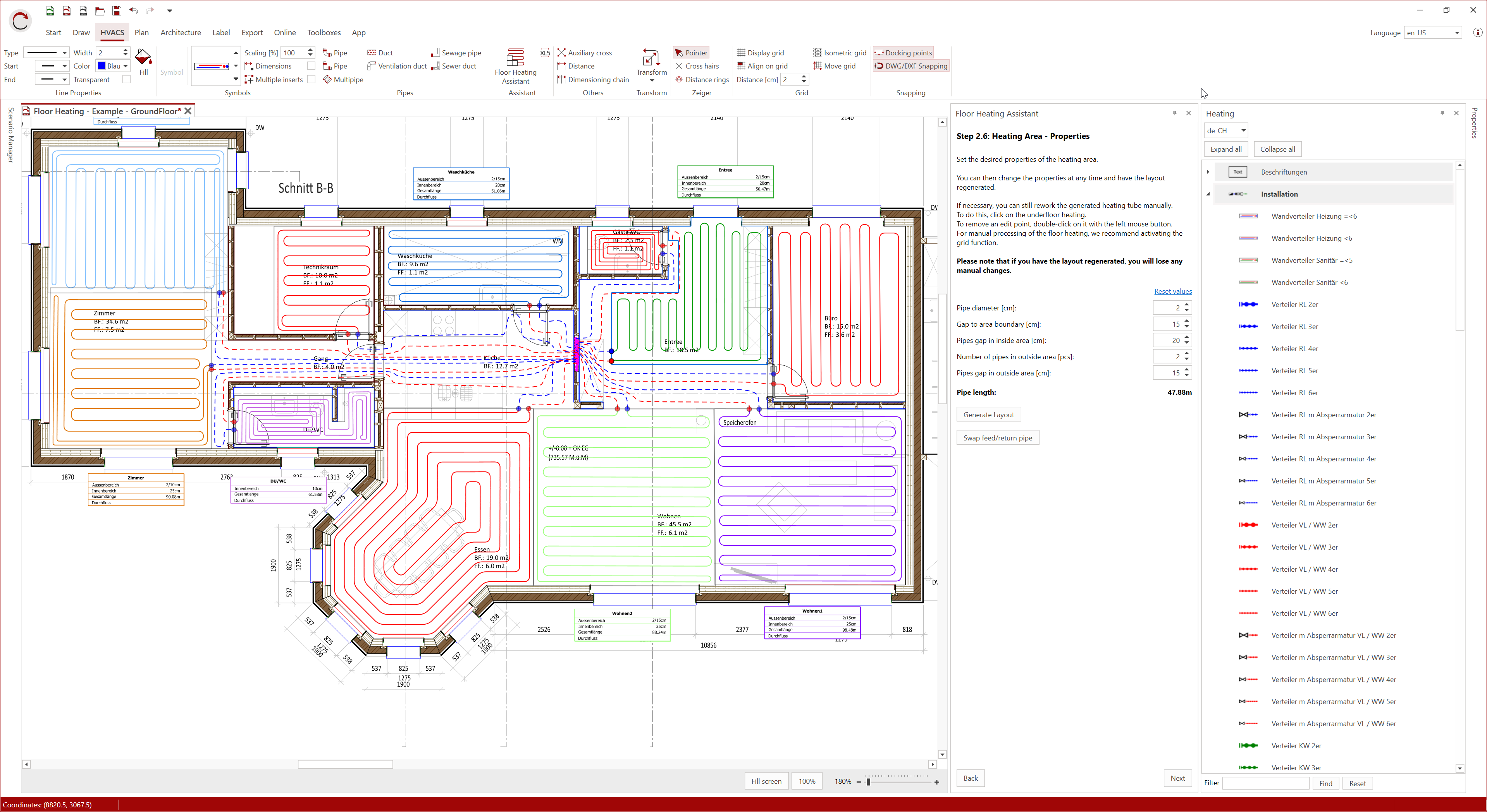 Common CAD formats such as DWG, DXF and PDF can be easily imported and processed. The integrated underfloor heating assistant supports you in the quick and precise implementation of your heating projects. Schematic representations in portrait or landscape format in sizes up to DIN can also be created without any problems. Functions such as parts lists, plan headers and room stamps ensure complete and clear project documentation – for planning that is not only efficient, but also professional and enjoyable.